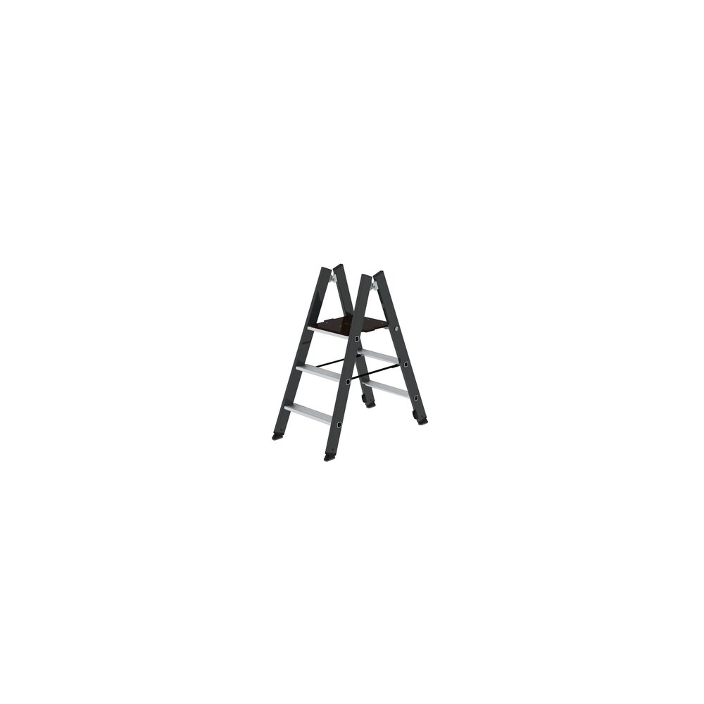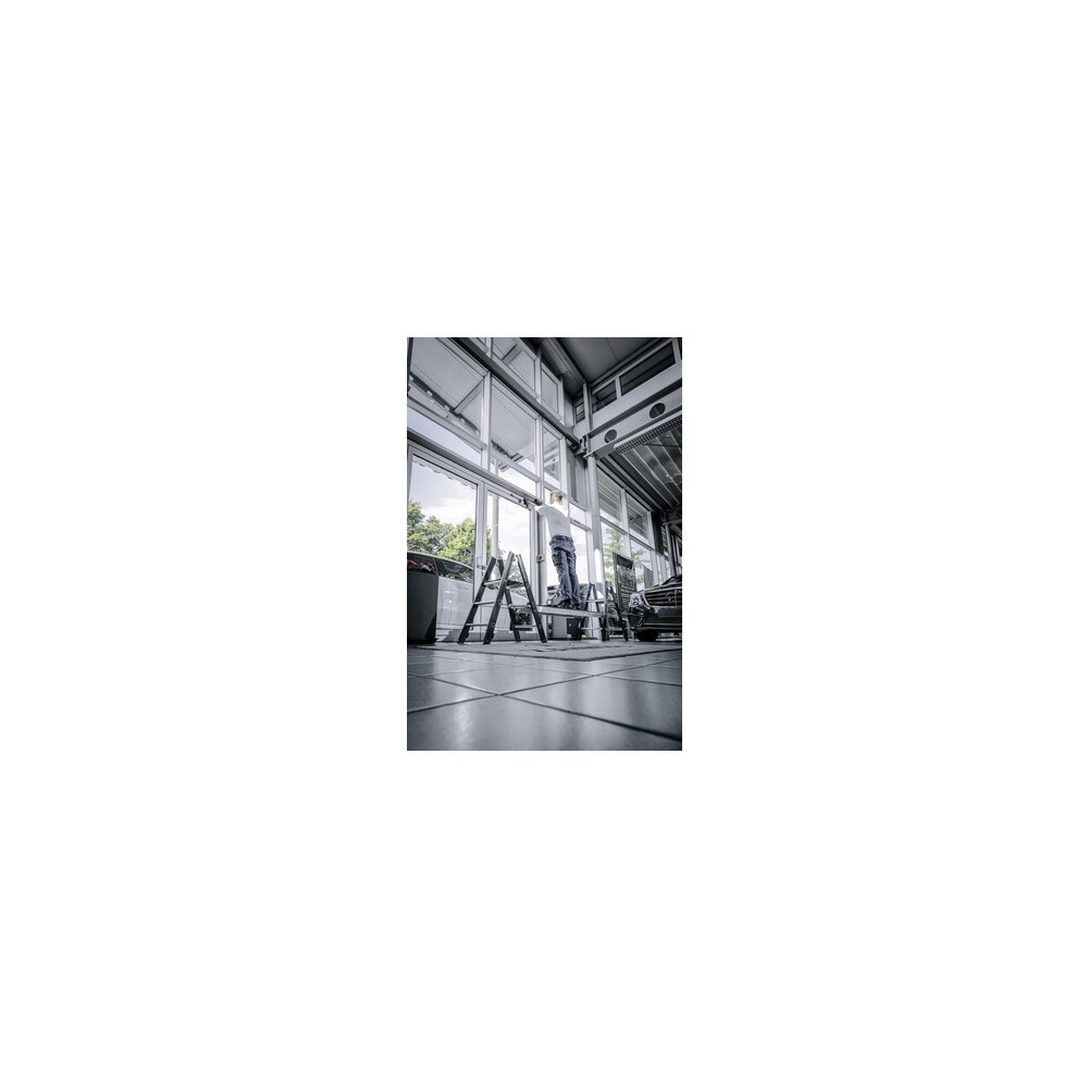 Klapptritt beidseitig begehbar. Plattform aus Holz-Siebdruck. Stabile Rechteckrohrholme, pulverbeschichtet. Große Standfläche (310 x 385 mm) mit integriertem Griffloch. Konische Holmführung für einen sicheren Stand. Spreizsicherung mit zwei hochfesten Polyestergurten. Leicht im Transport, platzsparend in der Aufbewahrung. Nivello® Leiterschuhe mit patentierter 2-Achsen-Neigungstechnik.