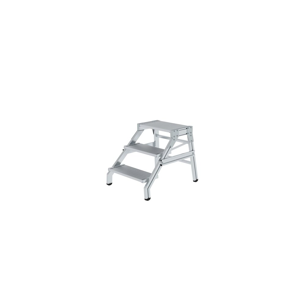 Montagetritt. Besonders stabile Konstruktion aus Rechteckrohr-Holmen. 200 mm tiefe Stufen mit Riffelung für einen sicheren Stand. Rutschfeste Kunststoffschuhe. Leichte Montage.