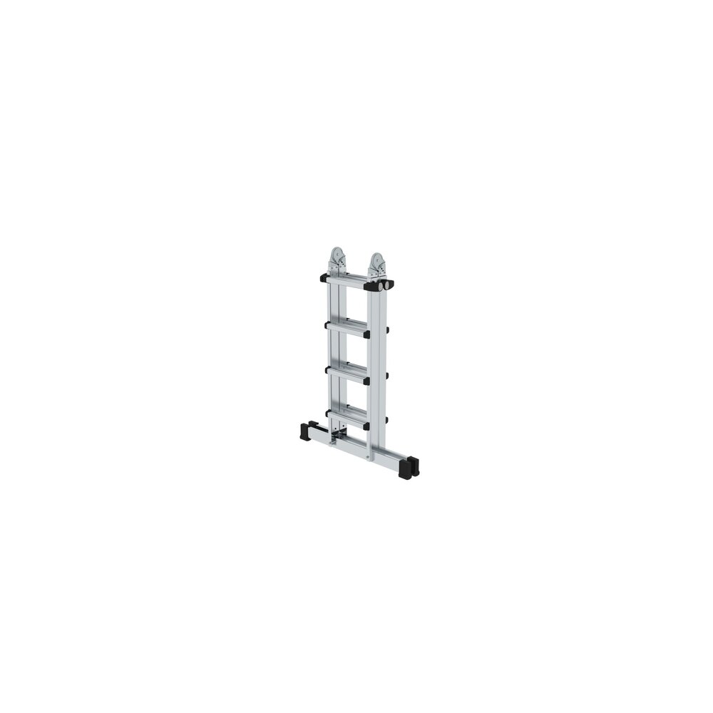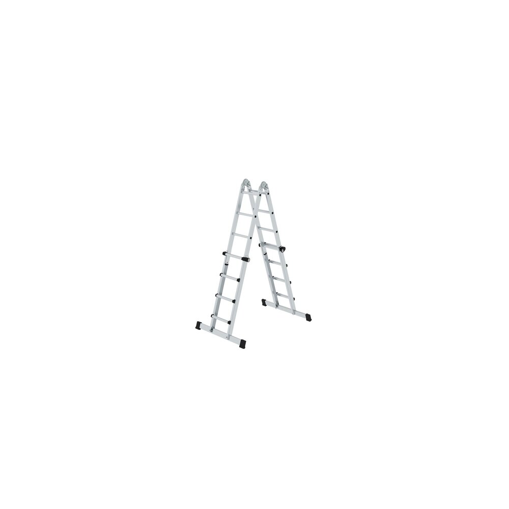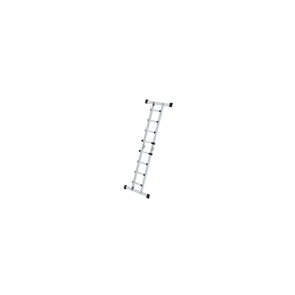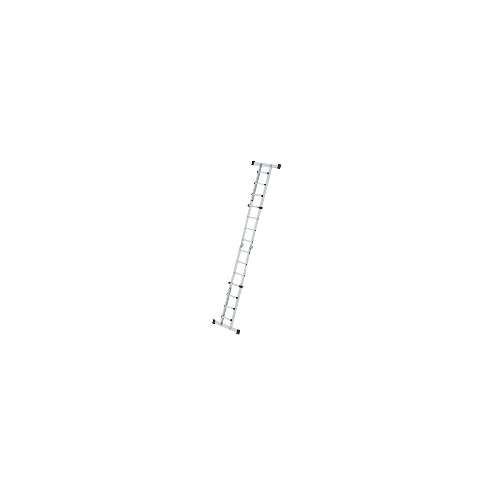 Sprossen-Teleskopleiter, einsetzbar als Steh- und Anlegeleiter. Stabile Rechteckrohr-Holme. Beidseitig geriffelte Vierkantsprossen 30 x 30 mm. Hochfeste Sprossen-/Holmverbindung. Treppengängig. Mittig durch automatisch verriegelnde Stahlscharniere klappbar. Beide Außenteile von Sprosse zu Sprosse teleskopierbar.