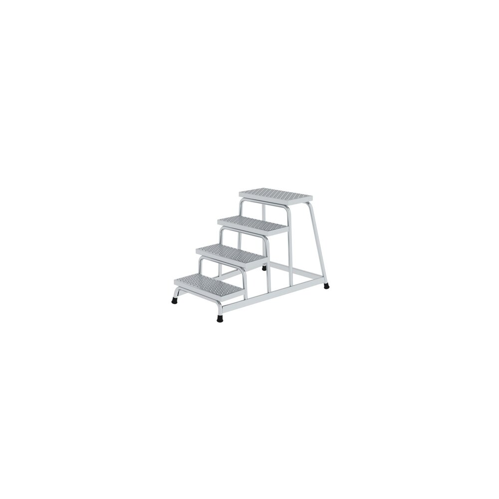 Arbeitspodest, starr. Stabile verschweißte Rohrkonstruktion. 220 mm tiefe Stufen aus Aluminium-Lochblech mit zertifizierter Rutschhemmung R 13. Rutschfeste Kunststoffschuhe.