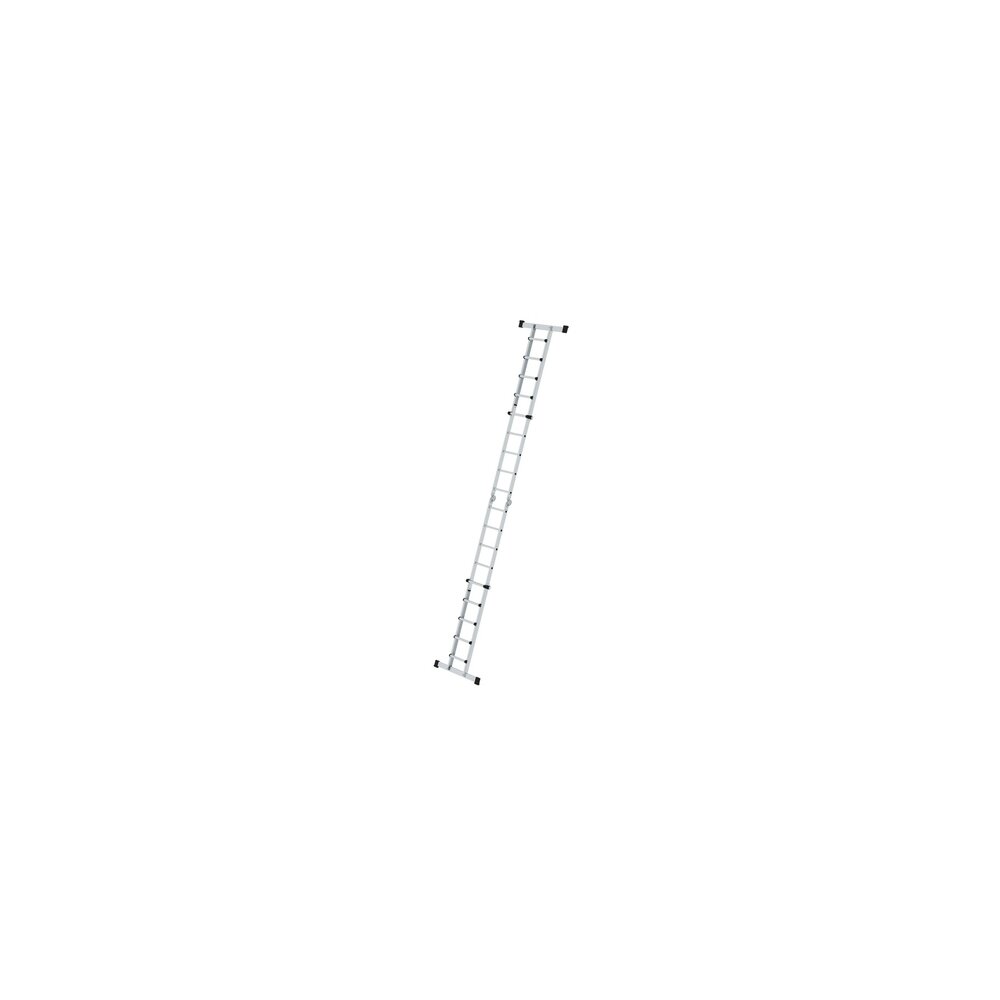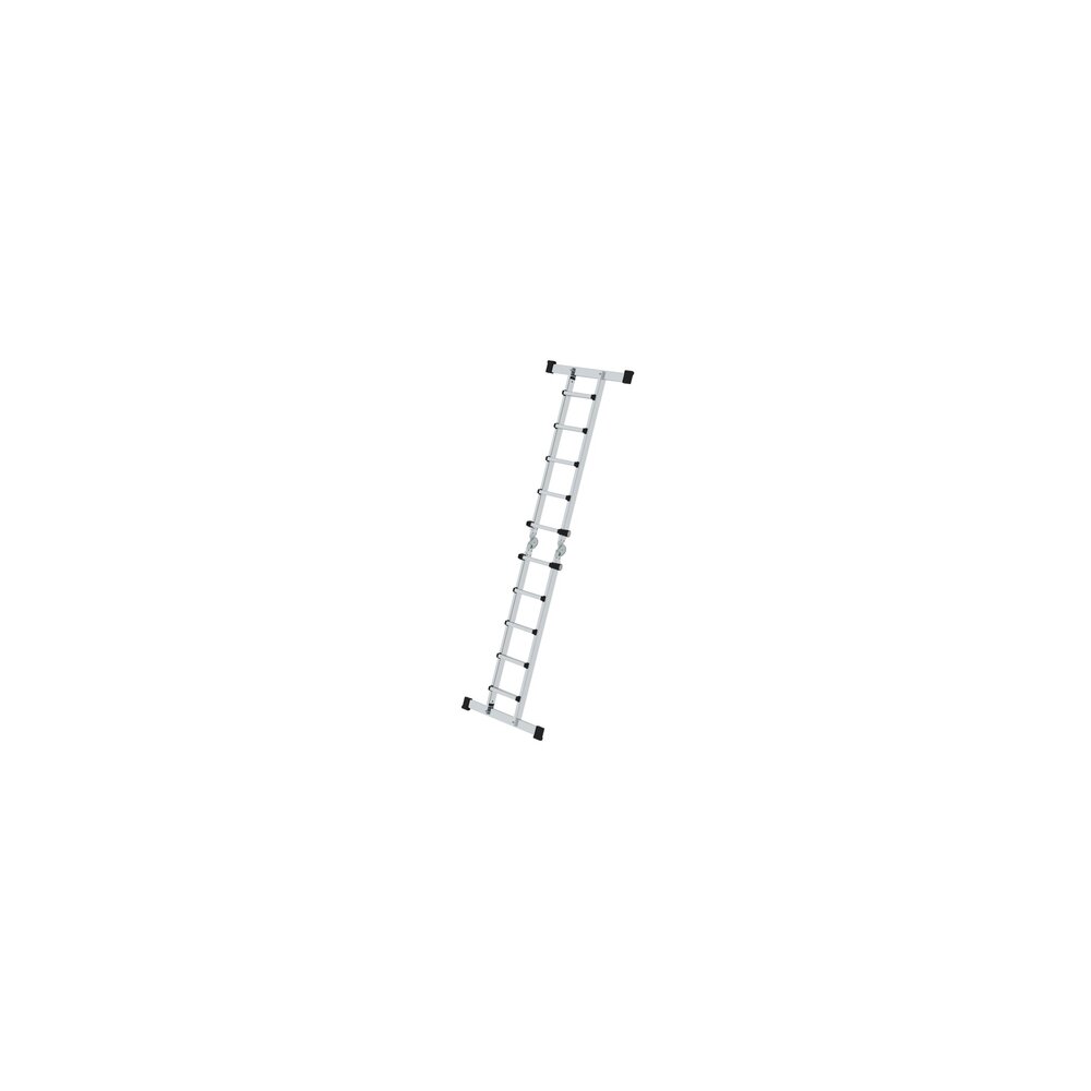 Sprossen-Teleskopleiter, einsetzbar als Steh- und Anlegeleiter. Stabile Rechteckrohr-Holme. Beidseitig geriffelte Vierkantsprossen 30 x 30 mm. Hochfeste Sprossen-/Holmverbindung. Treppengängig. Mittig durch automatisch verriegelnde Stahlscharniere klappbar. Beide Außenteile von Sprosse zu Sprosse teleskopierbar.