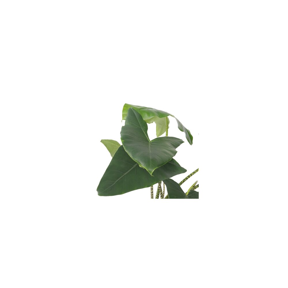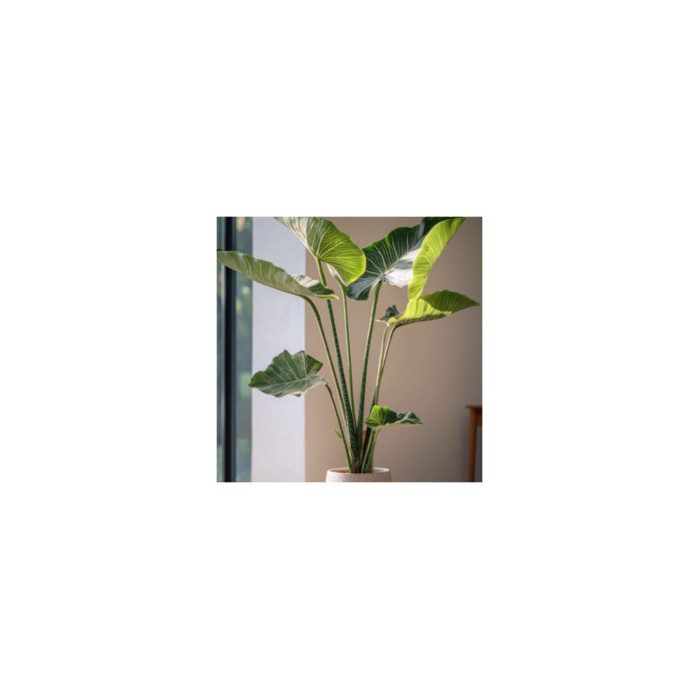 Diese riesige Alocasia Zebrina ist eine äußerst beliebte und bekannte Zimmerpflanze. Ursprünglich stammt die Alocasia aus Asien, wo die Pflanze im Regenwald wächst. Aber heutzutage ist diese elegante tropische Pflanze mit ihren fantastisch gestreiften Stängeln oft in Häusern zu finden. Diese Stängel sind schwarz und weiß, genau wie ein Zebra. Charakteristisch für Alocasia sind die ungewöhnlichen Stängel in Kombination mit den schönen grünen Blättern. Die schönen herzförmigen Blätter erinnern auch an die Schlappohren eines Elefanten. Aus diesem Grund wird die Pflanze auch "Elefantenohr" genannt. Aufgrund ihrer Herkunft aus tropischen Regionen bevorzugt die Alocasia Zebrina eine feuchte Umgebung. Deshalb ist es auch wichtig, die Blumenerde stets feucht zu halten, indem man regelmäßig kleine Spritzer Wasser gibt. Geben Sie vorzugsweise kein kaltes Leitungswasser: Die Alocasia ist recht empfindlich. Stellen Sie die Pflanze vorzugsweise an einen hellen Ort, jedoch nicht direkt in die Sonne. Es ist auch gut zu wissen, dass, sobald die Alocasia neue Blätter bildet, ein älteres Blatt gelb werden und anfangen kann, herabzuhängen. Diese werden am besten direkt über dem Boden abgeschnitten. Schließlich kann die Zebrina Blätter bis zu einer Größe von 150 cm wachsen lassen! Seien Sie vorsichtig, denn die Alocasia Zebrina ist giftig für Menschen und Haustiere.