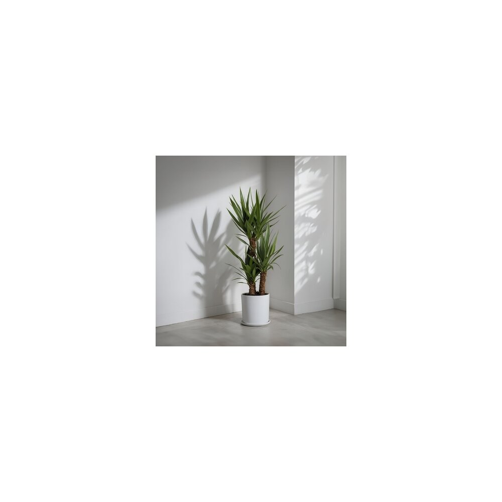 Die Yucca Elephantipes ist eine große Zimmerpalme, die ihren Ursprung in Mittelamerika hat. Hier wird diese Palmenart häufig in großen Baumschulen tief im Regenwald kultiviert. Ihren Namen verdankt die Yucca ihrem schweren Wurzelstock, der an Elefantenfüße erinnert. Das Blatt der Yucca Elephantipes ist dick und fleischig mit einem scharfen, fein gezackten Rand. Die unteren Blätter von Yucca sterben natürlicherweise ab, wenn die Zimmerpflanze wächst. Diese sollten vorsichtig entfernt werden, um ein aufgeräumtes Erscheinungsbild zu erhalten. Die Yucca ist eine der einfachsten Zimmerpflanzen überhaupt, da die Pflanze nicht viel Wasser benötigt. Einmal alle zwei Wochen zu gießen ist mehr als genug. Es ist sehr wichtig, dass kein Wasser am Boden des Topfes zurückbleibt, da sonst die Wurzeln faulen. Die Yucca bevorzugt einen hellen Standort, achten Sie jedoch darauf, dass sie nicht direktem Sonnenlicht ausgesetzt ist. Direkte Sonneneinstrahlung führt zu einer Verfärbung der Blätter. Alle 2-3 Monate benötigt die Yucca ausreichend Nährstoffe, damit die Blätter schön grün bleiben. Bitte beachten Sie, dass die Pflanze für Mensch und Tier giftig ist!