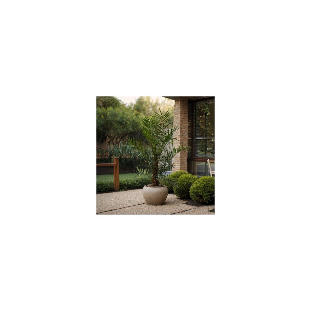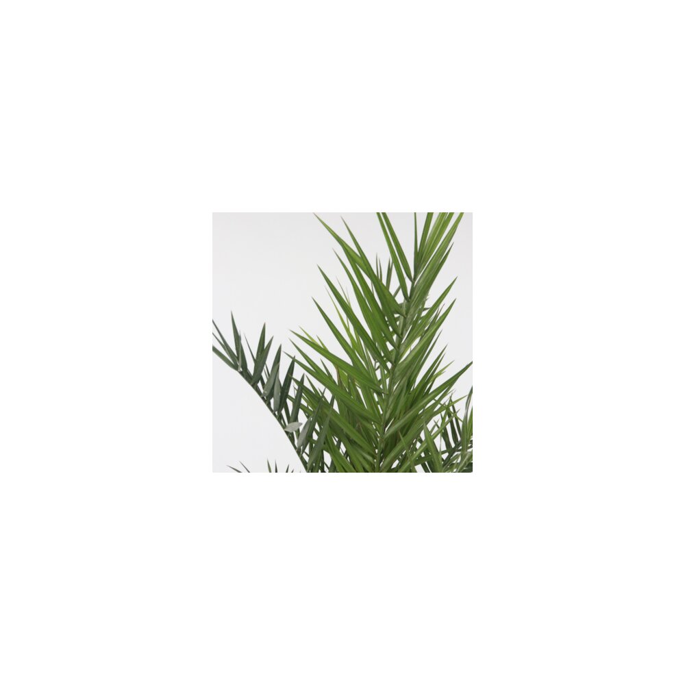 Die Phoenix Canariensis, besser bekannt als Kanarische Dattelpalme, stammt von den Kanarischen Inseln. Es gibt viele verschiedene Arten des Phönix, von denen die Canariensis die bekannteste und häufigste ist. Phoenix Canariensis ist heutzutage in jedem tropischen Klima zu finden, aber in Spanien und Italien werden diese Palmen oft als Pflanzenmaterial entlang öffentlicher Straßen verwendet oder als Zierpflanzen gepflanzt. In einem tropischen Klima kann diese Palme bis zu 18 Meter hoch werden mit Blättern von 5 bis 6 Metern Länge. Sie können die Palmen auch draußen pflanzen, da sie winterhart sind. Der Phoenix Canariensis bevorzugt einen sonnigen Standort (volle Sonne ist kein Problem) und einen sehr durchlässigen Boden. Im trockenen Frühling und/oder in heißen, trockenen Sommern täglich gießen. Halten Sie die Palme immer in gut durchlässiger Erde und lassen Sie überschüssiges Wasser direkt aus dem Topf ablaufen. Es wird empfohlen, die Palme einmal im Jahr mit konzentrierter oder flüssiger Pflanzennahrung zu düngen. Der Phoenix Canariensis ist ein kräftiger Wurzelwurzler und kann in die Erde oder in einen Topf gepflanzt werden. Achten Sie bei einem Ziertopf darauf, dass der Pflanze ausreichend Platz gegeben wird. Die Pflanze ist mäßig winterhart und verträgt bis zu 5 Grad Frost.
