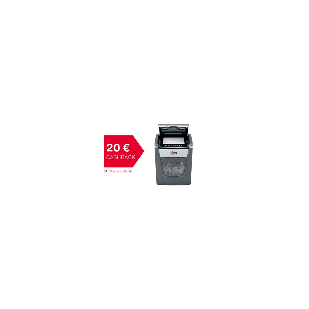 Keine Zeit, am Aktenvernichter zu stehen? Beim Schreddern großer Papiermengen sparen Rexel Autofeed Aktenvernichter bis zu 98 % Ihrer Zeit - genau die Wartezeit, die bei einem Standard-Schredder für die manuelle Papierzuführung benötigt wird. Warum also warten, wenn Sie auch automatisch mit Rexel schreddern können? Rexel startet im Aktionszeitraum vom 01. Oktober bis 31. März 2026 eine Cashback-Kampagne auf ausgewählte Aktenvernichter. Gehen Sie auf https://www.rexeleurope.com/de-de/promotions/cashback, um Ihren Beleg einzureichen und zu sparen!