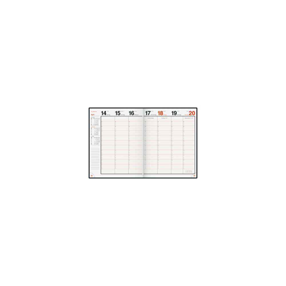 | Ausführung des Inhalts (bzgl. der Hauptausstattungsteile) | Jahresübersicht Vorjahr, aktuelles Jahr und Folgejahr, 6 Seiten Monatsplan Folgejahr, 16 Seiten Adressen auswechselbar, 14 Seiten Wissenswertes, Ferientermine Deutschland |