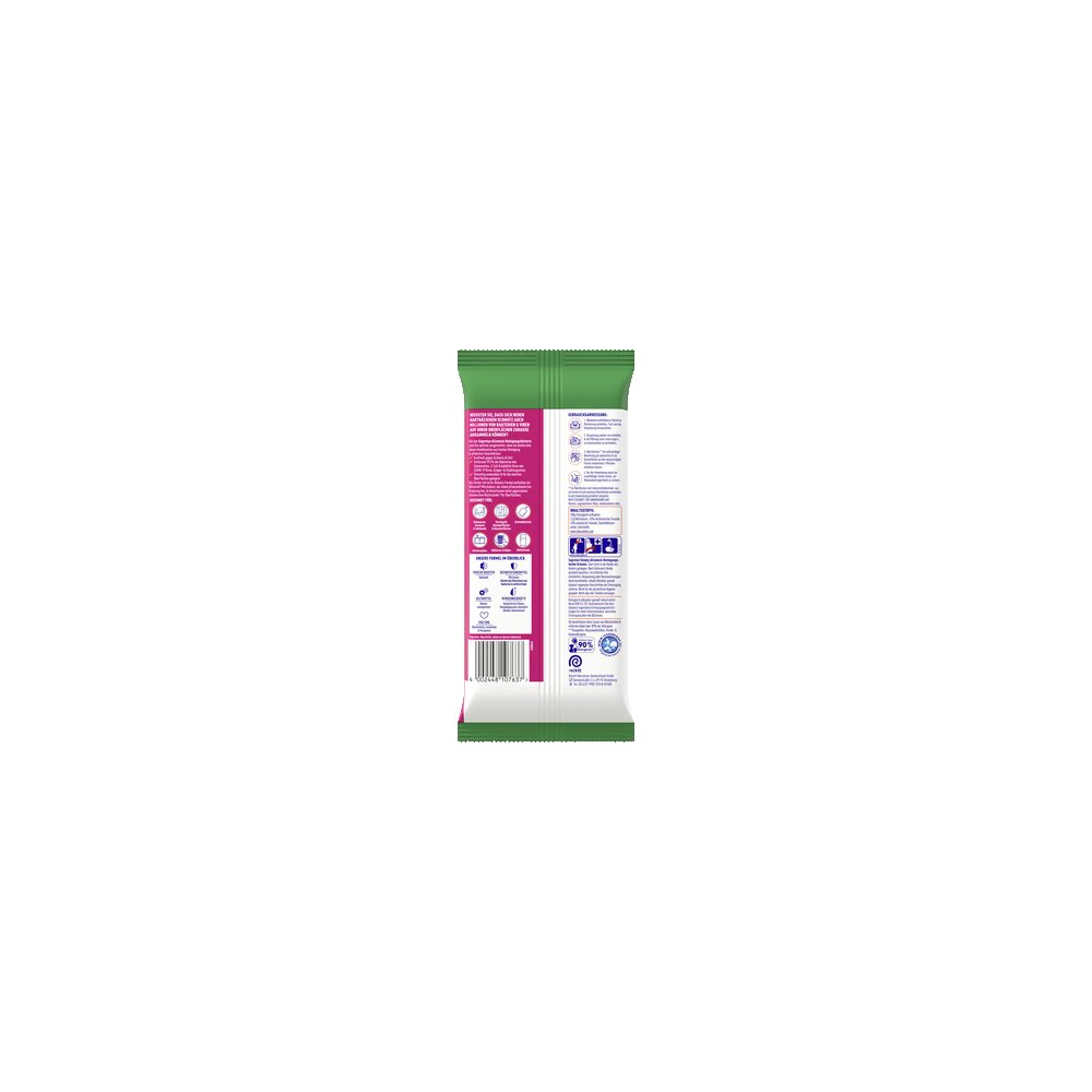 Die Allzweckreinigungstücher entfernen 99,9% der Bakterien, säubern effektiv und desinfizieren zugleich - für saubere Oberflächen und Desinfektion im ganzen Haus. Die feuchten Hygienetücher eignen sich ideal für eine schnelle Reinigung zwischendurch und hinterlassen einen angenehmen, frischen Duft nach Blütenfrische & grünem Apfel. Die Tücher bestehen aus biologisch abbaubaren, pflanzenbasierten Fasern und sind dennoch besonders reißfest in der Anwendung. Die Activ-Botanic Formel enthält einen pflanzenbasierten Inhaltsstoff Milchsäure und hinterlässt keine aggressiven chemischen Rückstände für Oberflächen. Inhaltsstoffe: 100 g Flüssigkeit enthalten: 3,2 g Milchsäure,