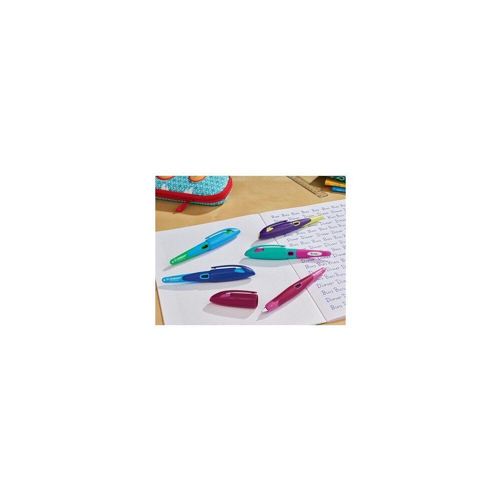 Der ergonomisch geformte Schulfüller STABILO EASYbirdy® wurde speziell für Schüler entwickelt, die ihre Schreibfähigkeiten mit Leichtigkeit verbessern möchten. Einzigartig ist der STABILO EASYbirdy® in vielerlei Hinsicht: So lässt sich die Feder in drei Winkeln optimal an die Handhaltung des Kindes anpassen. Dadurch liegt die Feder immer in einem optimalen Winkel auf dem Papier und sorgt für ein einzigartig weiches Schreibgefühl und ein sauberes Schriftbild. Kein Kratzen – kein Klecksen! Somit erleichtert dieser innovative Füller für die Schule auch die Entstehung und Ausprägung der eigenen Handschrift. Nachfüllbar ist der Füller mit zwei Standardpatronen. Das extra große Sichtfenster sorgt für die leichte Kontrolle des Tintenstandes bei beiden Patronen.