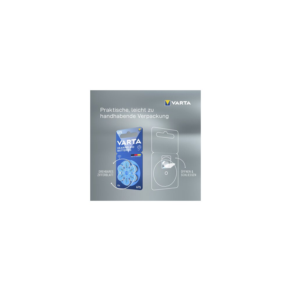 Das hochwertige VARTA Hörgerätebatterien-Sortiment bietet die perfekte Energieversorgung für Standard- und neueste Hochleistungs-Hörgeräte. Zuverlässige, langanhaltende Energie mit höchster Qualität und Leistung ermöglicht Hörgeräteträgern, klar zu hören, effektiv zu kommunizieren und ihre Lebensqualität zu verbessern. Die Premium-Batterien liefern eine stabile Spannung für drahtloses Streaming und ermöglichen so eine effizientere Verbindung und klaren Klang mit Audiogeräten. Alle VARTA-Hörgerätebatterien haben ein hochwertiges, auslaufsicheres Design, das eine sichere Leistung gewährleistet, damit die Verbraucher ihre Unabhängigkeit genießen können.