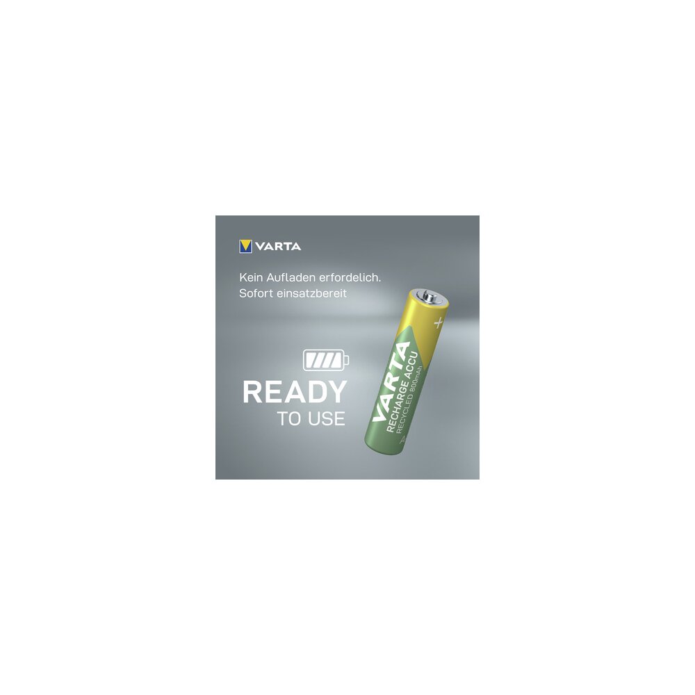 VARTA Recharge Accu Recycled ist die umweltfreundlichste Produktlinie von VARTA mit einem Recyclinganteil von 25 %. Die Produktlinie kombiniert beste Batterieleistung, einschließlich sehr geringer Selbstentladung und "Ready To Use"-Technologie, mit einem hohen nachhaltigen Wert, um den höchsten Verbraucheransprüchen gerecht zu werden.