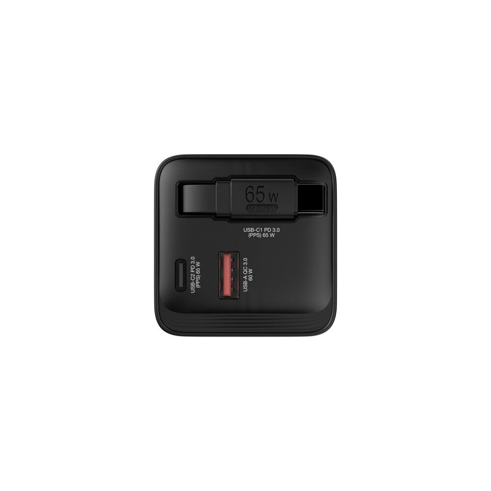 Verbatims 65W GaN-Ladegerät kombiniert einen USB-C®- und einen USB-A-Anschluss sowie ein integriertes einziehbares USB-C-Kabel in einem kompakten, handflächengroßen Design. Der USB-C-Anschluss und das Kabel unterstützen PD 3.0 (Power Delivery) bei 65 W, während der USB-A-Anschluss QC 3.0 unterstützt. Ideal für das Büro, zu Hause oder unterwegs, um Ihren Laptop, Ihr Tablet, Ihr Smartphone, Ihre Spielegeräte und vieles mehr mit Strom zu versorgen. Das einziehbare USB-C-Kabel lässt sich auf über 80 cm verlängern, wodurch unterwegs der Bedarf an zusätzlichen Kabeln reduziert wird, und die Ausgangsanzeige zeigt die Gesamtleistung an, die verwendet wird, unabhängig davon, ob sie von einem oder einer Kombination von Anschlüssen stammt. Das GaN-Ladegerät kann in mehreren Ländern verwendet werden. Die US-Anschlüsse sind klappbar und es enthält austauschbare EU- und UK-Stecker. Der ultimative Reisebegleiter. Die Galliumnitrat-(GaN-)Technik sorgt für schnelles, effizientes Laden mit hoher Leistung bei geringerer Wärmeentwicklung. Da GaN-Ladegeräte kleiner und leichter als herkömmliche Ladegeräte auf Silikon-Basis sind, sind sie extrem einfach zu transportieren und ideal für unterwegs. Das GaN-Ladegerät wird aus qualitativ hochwertigen, nicht entflammbaren Materialien hergestellt.