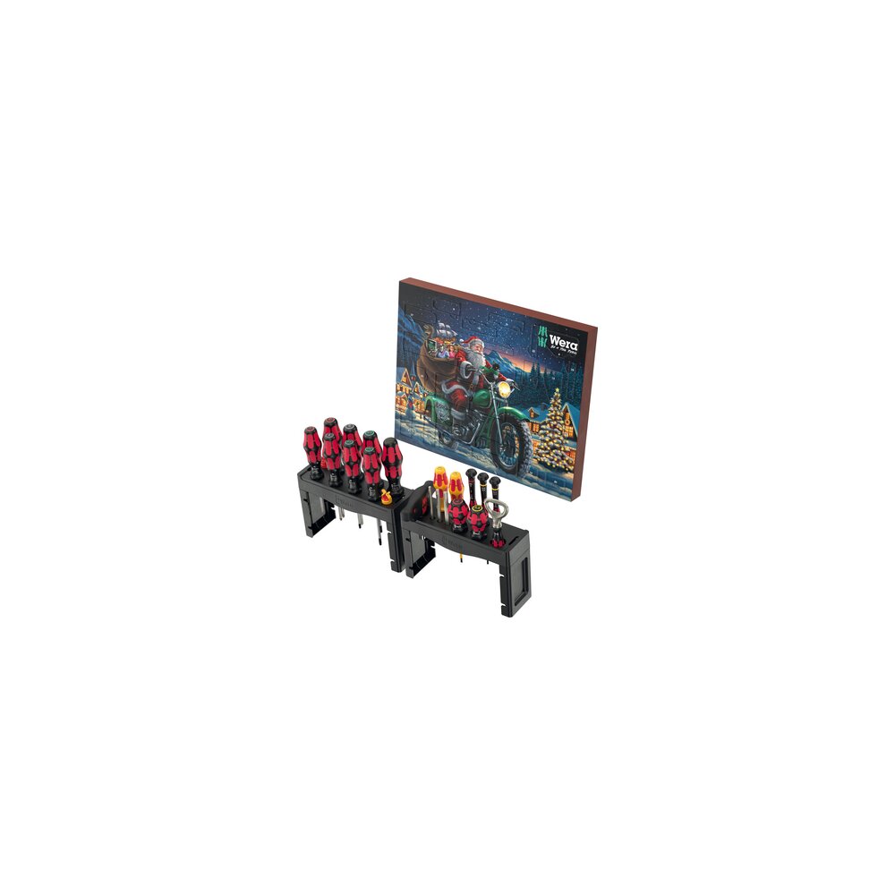 Der Wera Adventskalender beinhaltet 2025 eine umfassende Schraubwerkstatt für die gängigsten Schraubprofile und Anwendungen. Die beiden mitgelieferten Racks können aufgestellt oder an der Wand befestigt werden. Auf 28 Überraschungen darf sich der Beschenkte/die Beschenkte freuen: 15 Schraubendreher, darunter 2 Schlitzwerkzeuge für VDE, 2 Stubbys, 3 Micro Werkzeuge für die Feinmechanik und einen Schraubmeißel mit Schlagkappe und durchgehender Klinge. 1 Bithalter mit Quergriff für ¼" Bits und 3 lange Bits (89 mm) runden den Inhalt ab. Der Quergriff liegt gut in der Hand und erlaubt die Übertragung hoher Drehmomente. Die beiden Schraubkrallen halten Schrauben sicher auf dem Werkzeug. Der Flaschenöffner ist ein Muss für alle Adventskalender Fans, auch 2025 im speziellen und nur im Kalender enthaltenen Design. 2 Racks sorgen für ordentliche Verstauung aller Werkzeuge (und des Flaschenöffners).